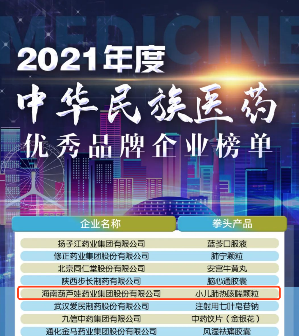 12月29日,全国工商联医药业商会发布了“2021年度中华民族医药优秀品牌企业榜单”,PA真人药业集团凭借黄金单品小儿肺热咳喘颗粒(4克)实力登榜。