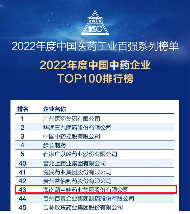 会议期间,一年一度的中国医药工业百强系列榜单隆重揭晓,PA真人药业集团凭借领先的研发优势和扎实的生产实力以及稳健的市场推广能力,连续第四年成功入选“2022年度中国中药企业TOP100排行榜” ,排名稳步上升至第43位。