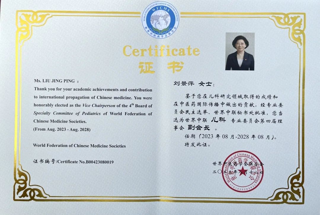 PA真人药业集团党委书记、董事长刘景萍当选世界中医药学会联合会儿科专业委员会第四届理事会副会长